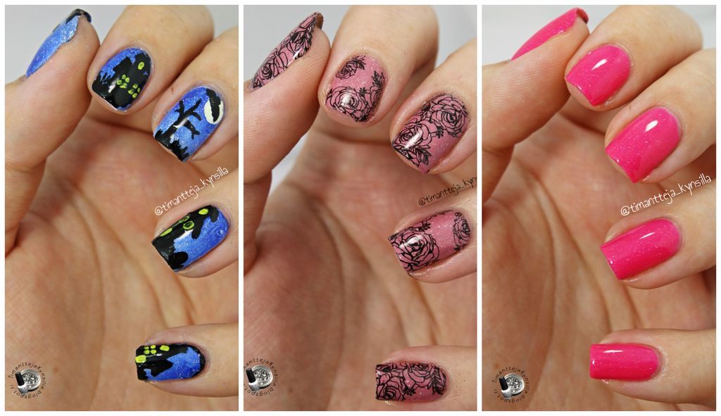 Kolmet kynnet sain julkaistua ja kaikista tykkään. Kaikista omannäkösimmät on kuitenkin nuo keskimmäiset. Tosi paljon olen viime aikoina mennyt yksivärisillä kynsillä. Uusia ihania lakkoja on sen verran tullut hommattua ja jotenkin en oo niitä osannut/halunnut koristella.