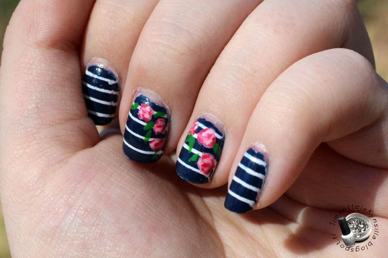 Mulla oli vähän ongelmia noiden raitojen kanssa. Sininen levähti teippien pois oton jälkeen, mutta sain tilanteen korjattua, jotenkin siveltimellä ja valkosella lakalla. Tein myös ihan ekaa kertaa akryylimaalilla ruusuja ja ainaki mun mielestä ne onnistu hyvin.