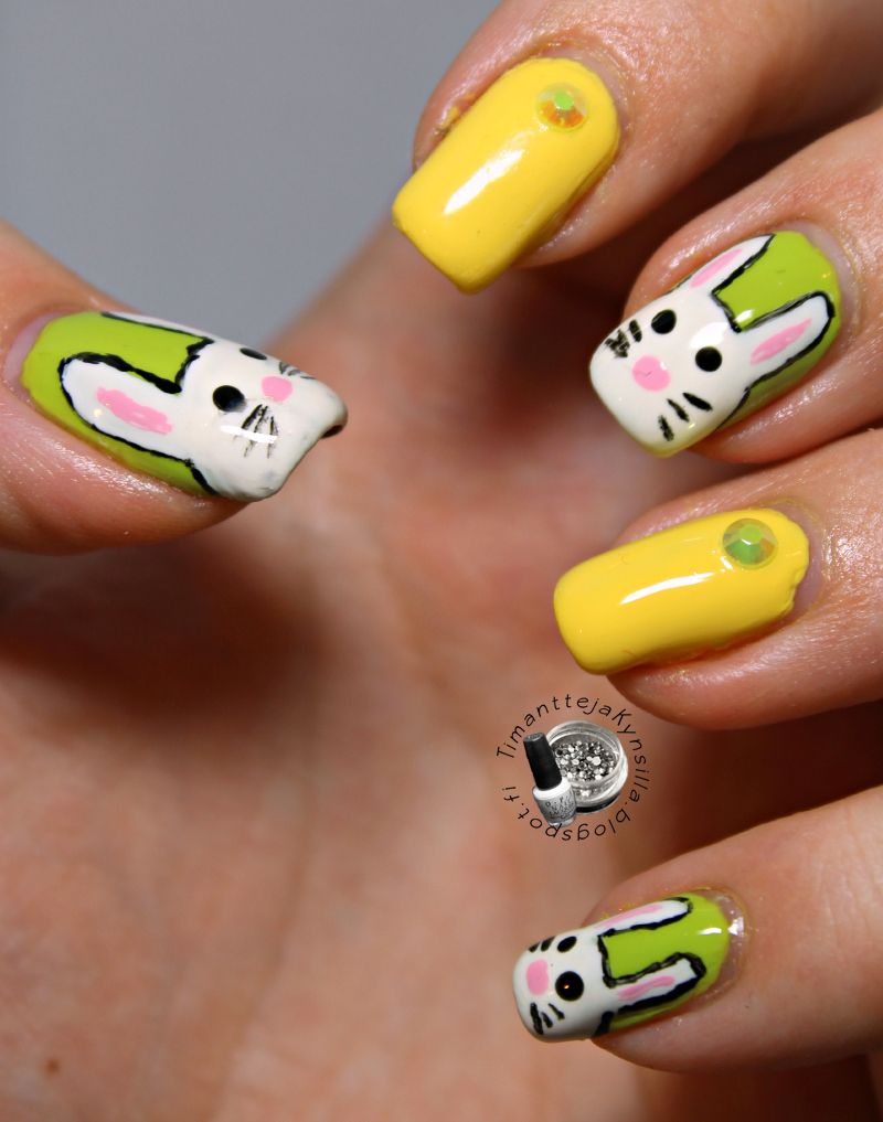 Ensimmäinen haaste tälle viikolle ja valitsin pääsiäishaasteen. Ihan vaan sen takia, kun halusin käyttää yhtä uutta lakkaani, joka sopii täydellisesti pääsiäisen väreihin. Plus halusin lakata kynsilleni pupuja. Lapset varmaan töissä tykkää näistä kynsistä.