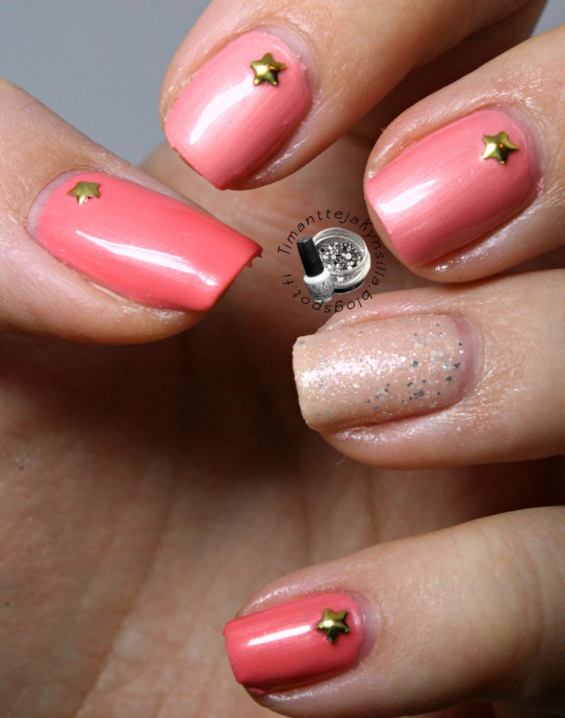Peach ihana tummemman koralli lakka hopeisella shimmerillä. Peittää kahdella kerroksella, ainakin mun kynsillä. Tähän ei edes siveltimen vedot jääneet näkyviin.Tykkään paljon, vaikka vierastinkin lakkaa aluksi sen shimmerin takia.