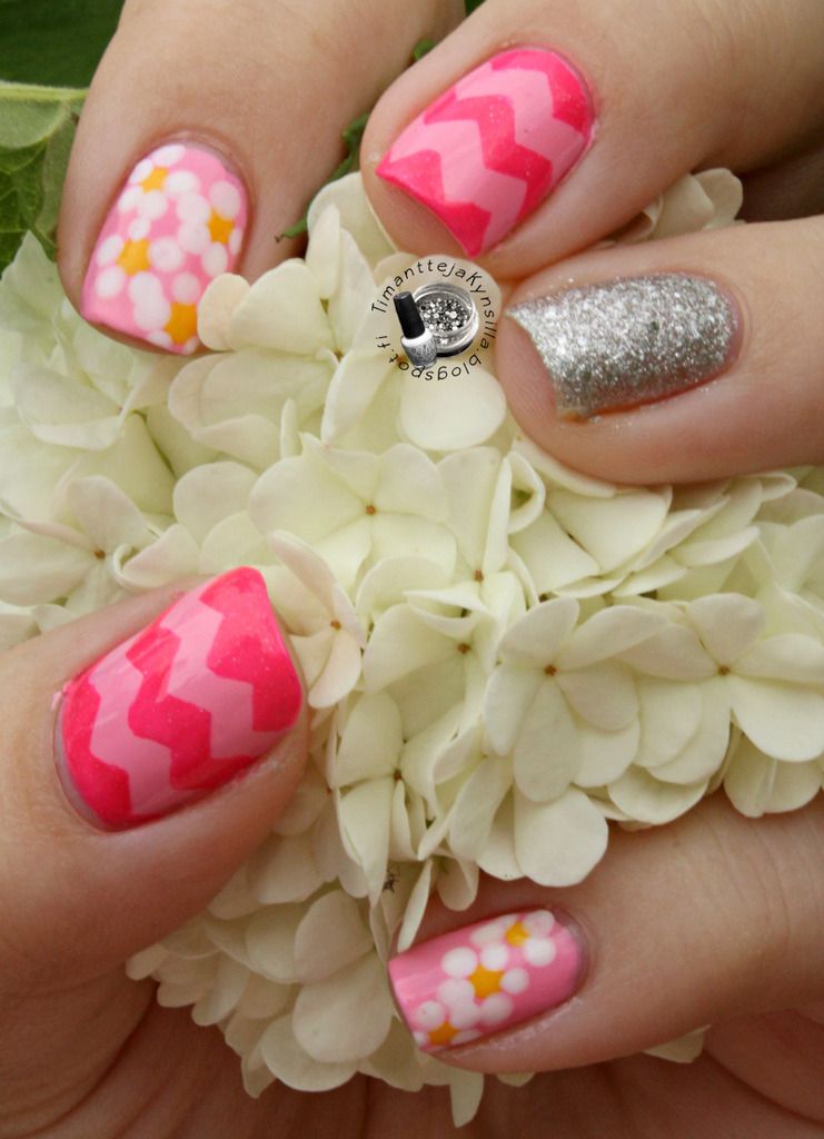 Nää kynnet tuli lakkailtua mökillä. Idea näihin lähti, kun lakkasin äitille kynnet edellisenä iltana, joissa oli ihania pilkutuskukkia. Mökillä mulla oli vaan rajallinen määrä kynsilakkoja mukana, ja se oli hieman hankalaa ideoida lakkauksia.